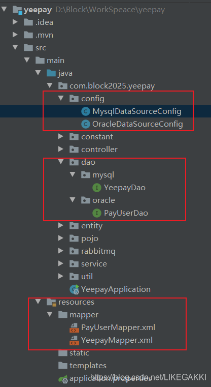 包结构中最重要的就是在dao层下再做细分,把你要操作的数据库对应的dao接口分开,我这里因为我操作的mysql和oracle所以就这么命名了,YeepayDao操作的是mysql里的一个库,PayUserDao操作的是Oracle里的某一个库。
